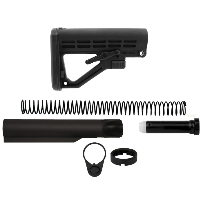Upgrade your AR-15 with this comprehensive Mil-Spec Buffer Tube Kit, designed for durability and performance. Featuring a robust 6-position stock, this kit allows for precise adjustment to suit your shooting style. The matte finish not only enhances the aesthetic appeal but also provides a non-reflective surface. Included is a carbine-length buffer spring and a 3 oz. buffer, ensuring smooth operation and reliable cycling. The kit also comes with a regular end plate and a secure castle nut, making installation straightforward and hassle-free. Perfect for those looking to enhance their firearm with quality components.