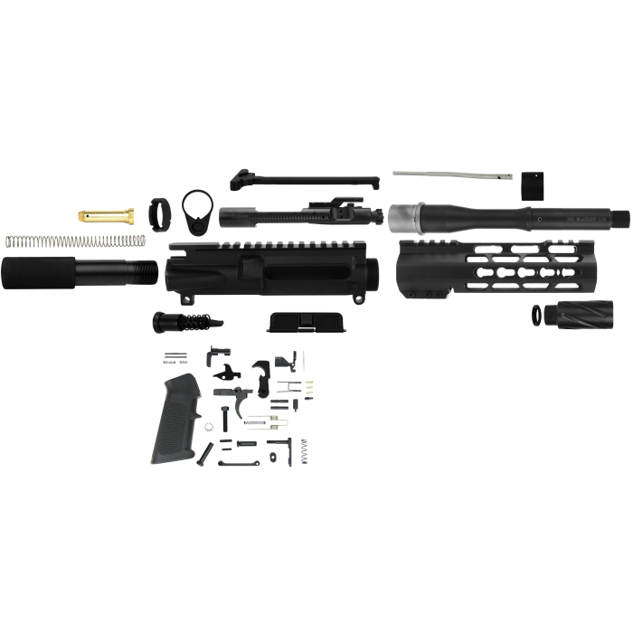 Tacfire AR-15 Pistol Build Kit Keymod 300 Blackout is the ultimate solution for firearm enthusiasts who demand precision and quality in an unassembled kit. Designed for versatile customization, it features a rugged 7.5" parkerized barrel with a pistol gas system, a 5.56/300 Blackout NATO bolt carrier group, and a sleek 7" ultra-slim keymod free-float handguard with detachable rails. Made in the USA, this complete kit includes essential components like a lower parts kit with trigger and hammer, mil-spec charging handle, buffer tube system, and a 5/8"-24 thread bird cage A2 muzzle brake. Built from durable black steel, with an upper receiver featuring M4 feed ramps, this build kit is perfect for AR-15 300 BO builds. Fully equipped for reliability and versatility, it's the premium choice for shooters seeking top-tier performance.