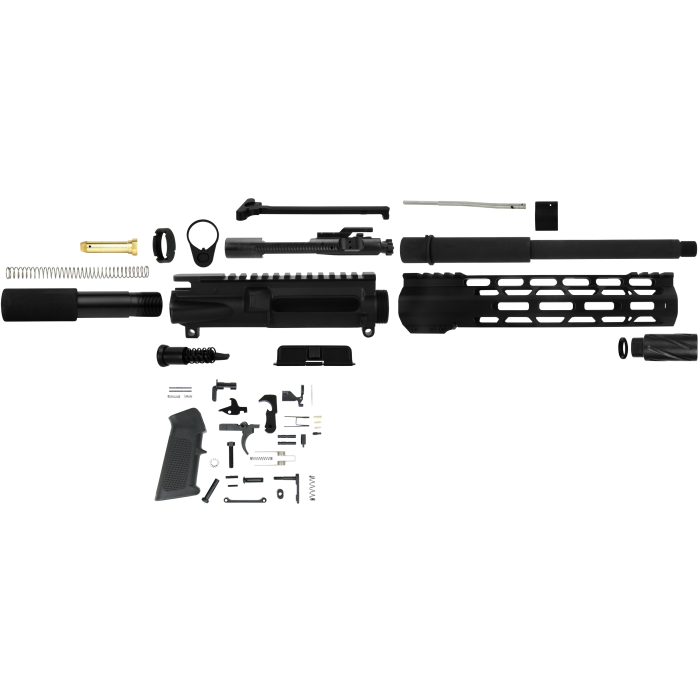 TacFire AR Build Kit Pistol 300 BLK Black Parkerized Steel delivers unmatched performance for custom AR pistol builds. Designed for versatility and durability, this kit includes a .300 AAC 10.5" parkerized barrel, .308 spiral fluted flash can with crush washer, and ultra-slim 7" M-LOK free float handguard for precision and sleek handling. Featuring a stripped billet upper receiver with M4 feed ramps, an MPI-tested nitride bolt carrier group, and a low-profile gas block, it ensures reliable and efficient operation every time. Complete with a mil-spec charging handle, pistol-length gas tube, and lower parts kit, this USA-made build is tailored for high-performance AR pistols.