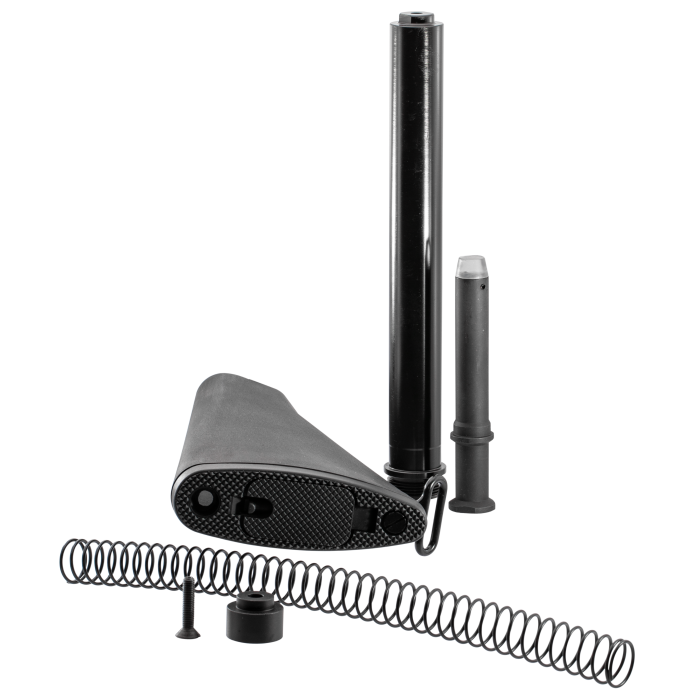 TacFire AR10 Stock Kit Black Polymer for .308 Platform is a durable, impact-resistant A2-style fixed stock designed for AR10/AR308 rifles. Crafted from black polymer, it fits standard AR-10/AR-308 lower receivers and includes everything you need: a rifle-length receiver extension tube, A2 buffer, buffer spring, spacer, and screw. The unique hinged butt plate reveals an internal storage compartment for added functionality, making it a versatile and dependable upgrade for your firearm.