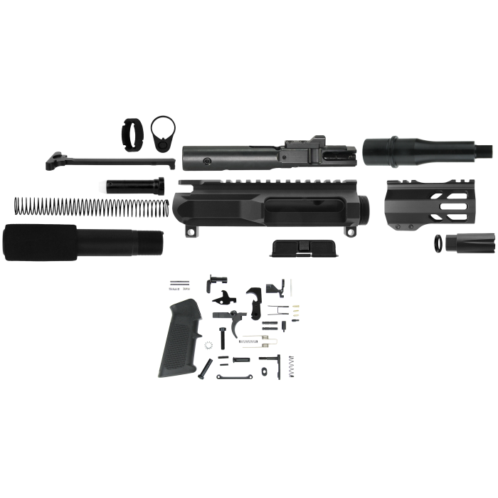 The TacFire 45 ACP Black Steel Pistol Kit is a comprehensive assembly package designed for enthusiasts looking to build a reliable and efficient firearm. Central to its construction is a USA-made 9MM 7.5-inch barrel and bolt carrier group, providing a solid foundation for accuracy and performance. The kit includes a MilSpec upper receiver, paired with a slim, free-floating MLOK handguard that ensures comfort and versatility in accessory attachment. A complete lower parts kit crafted in the USA offers durability and ease of assembly. The robust MilSpec pistol buffer tube, accompanied by a foam cover, heavy buffer, and spring, ensures stability and smooth operation. Essential components like the MilSpec charging handle, dust cover, forward assist, and a 12x36 thread flash forwarder complete the kit, making it an ideal choice for those seeking precision and quality in their firearm build.