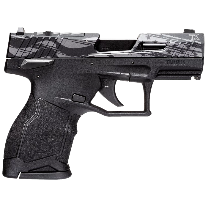 The Taurus TX22C TORO Compact is a reliable and stylish semi-automatic pistol chambered in .22 LR. With a sleek black frame and a striking USA Flag design on the optic-ready slide, it combines aesthetics with functionality. The pistol features a 3.60-inch steel barrel and offers a 10+1 round capacity, making it a versatile choice for target shooting or personal defense. Its manual safety, striker block, and trigger safety ensure secure handling, while fixed front and adjustable rear sights provide accurate target acquisition. This compact firearm is designed for those who appreciate precision and performance in a modern package.