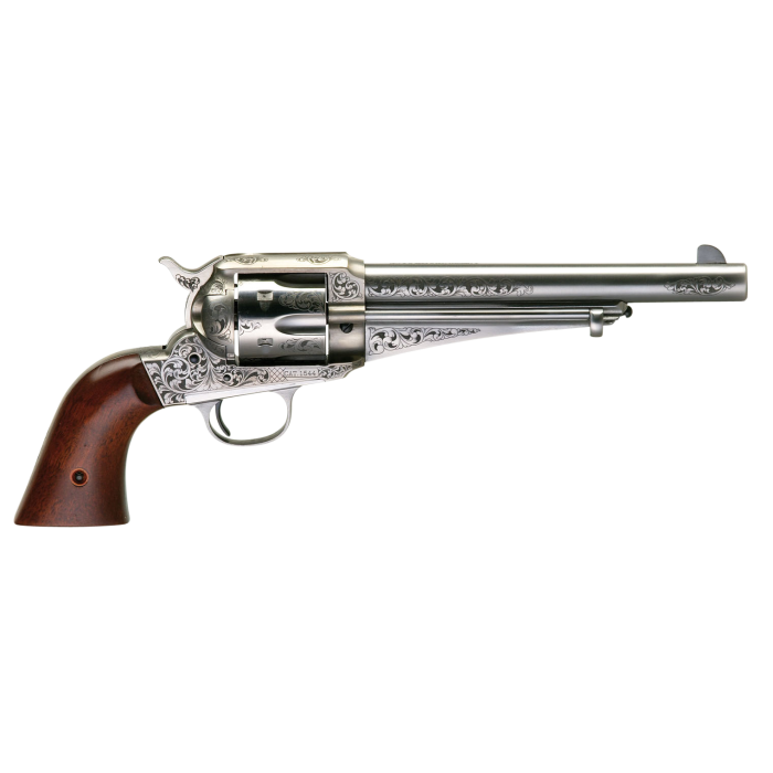 The 1875 army outlaw revolver is a faithful reproduction of the 1875 remington single actions, which kept the solid frame and overall styling of remington's 1858 percussion models.Ordinary citizens and wild west lawmen alike recognized the sturdy quality of the remington revolvers.The infamous frank james even carried one for most of his outlaw career.The reproduction is available in his favorite caliber, 45 colt, and features a steel backstrap and two-piece walnut grip.
