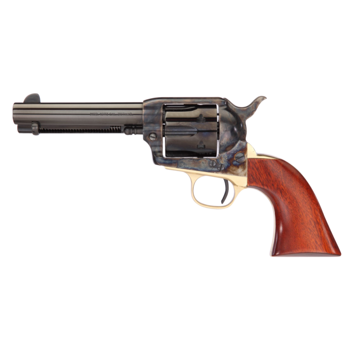 Taylor's & co.Model 1873 cattleman single-action is a classic western six-shot revolver.It is manufactured using the highest quality standards available.The frame is forged which results in better grain structure and strength, making it ideal for competitive shooting.The ranch hand is built on the cattleman new model forged frame.It features all the best qualities of the cattleman design while boasting the flashy brass backstrap & triggerguard.Besides the brass grip frame, the ranch hand features a case hardened frame with the remaining blued steel parts, and a smaller navy-size walnut grip.This 357 magnum model has a 4.75" barrel with blued finish, case hardened/brass frame, and blued cylinder.It is taylor tuned which features hand polishing and lighter hammer/trigger pull with custom springs.