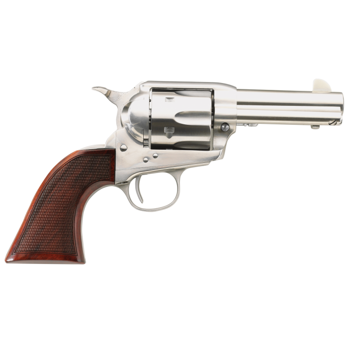 The runnin' iron has proven to be a favorite of mounted and ground shooters alike.It features a low-and-wide hammer spur, checkered one-piece walnut grip, and a wide trigger.This 45lc model has a 3.5" stainless barrel, cylinder, and frame finish.It has fixed front blade sight with a notched rear.
