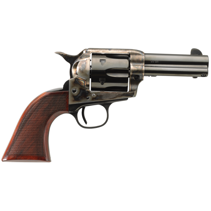 The runnin iron is a light, efficient, balanced single-action pistol designed specifically for the sport of mounted shooting.Inspired by mounted shooter and wild west entertainer denny chapman and designed by third-generation wild west showman and gunsmith deke rivers, the runnin iron has been created by cowboys with years of black powder blank shooting experience in the harshest environments.The runnin' iron features a low and wide hammer spur, wide trigger, checkered gunfighter-style walnut grip, second-generation transverse cylinder pin latch, crescent-style ejector rod; reduced-power spring kit, and extra clearance at the front and rear of the cylinder.These features make the runnin' iron the lightest and most efficient mounted shooting gun on the market.This deluxe edition model also includes custom tuning, custom hammer and base pin springs, trigger pull set at three pounds, jig-cut, positive angles on all triggers and sears for crisp action, a coil-loaded hand, and wire bolt.