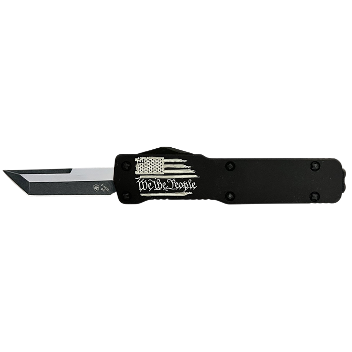 The Templar Knife® Premium Lightweight is a compact Cali-legal OTF designed for fast, reliable everyday carry in a small footprint. It uses a 1.85 in D2 steel tanto blade with a black oxide stonewashed, powder-coated finish for a low-glare look and practical wear resistance. A black aluminum handle with a US Flag “We The People” graphic keeps the knife lightweight while giving it a bold, themed style.
