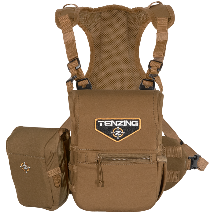 The Bino Harness is made from 300D Honeycomb Poly Oxford fabric ensuring top-tier durability. It features an enclosed magnetic closure for secure access batwing construction for easy attachment of accessories and a rangefinder pocket with a tether. Elastic straps provide flexibility to stretch over extra layers without adjustments.