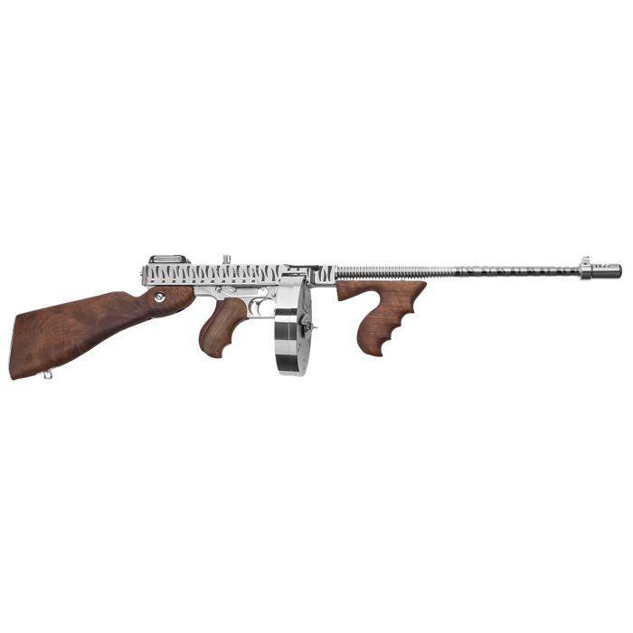 The Thompson 1927-A1 boasts a 16.5" barrel with a striking hard-chrome finish adorned with tiger stripes, making it as visually impressive as it is functional. This model comes with a 50-round drum magazine and a 20-round stick magazine, offering ample firepower for any situation. Chambered in .45 ACP, this firearm delivers powerful performance with every shot. The American Walnut stock adds a touch of elegance, while the steel receiver ensures lasting strength and resilience.