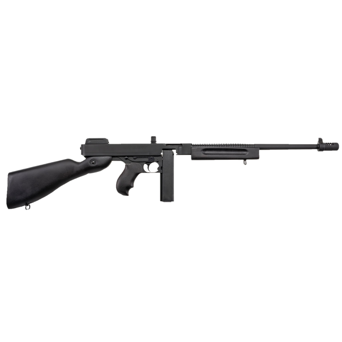 The Thompson 1927-A1 semi-auto carbine is a meticulously crafted firearm that pays homage to its legendary predecessor. Chambered in .45 ACP, this carbine features a 16.5" finned barrel and is enhanced with genuine American walnut woodwork. The Commando model includes a pinned compensator, extending the barrel length to 18". The frame and receiver are precision-machined from solid steel and finished with a durable black parkerized coating, ensuring both robustness and a sleek appearance. The walnut furniture is painted black, offering a striking contrast and added durability.