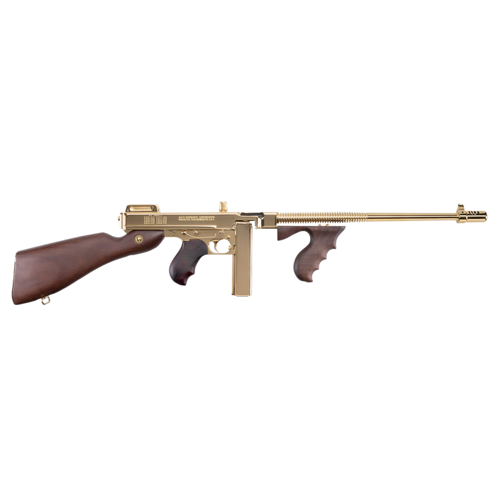 All the classic details of the time honored original are reproduced in today's semi-auto Thompson 1927-A1. This .45 caliber carbine features a 16.5" finned barrel and genuine American walnut woodwork. It has a blade front sight with an open rear adjustable sight. This Deluxe Semi-Auto model has a pinned compensator for an 18" barrel length. The frame and receiver are machined from solid steel and feature a titanium gold plated metal finish. It has a fixed buttstock, pistol grip and vertical foregrip. It includes one 50-round drum magazine with a gold finish and one 20-round stick magazine.