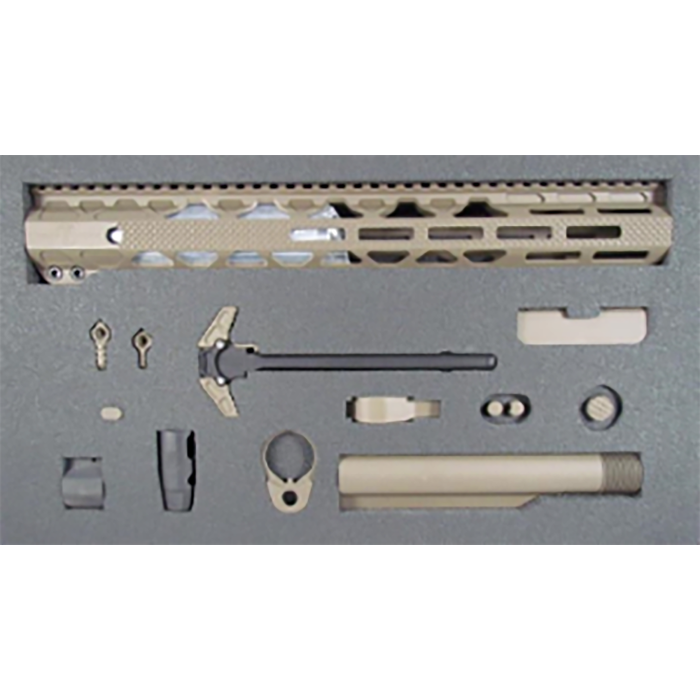 The Timber Creek Outdoor Greyman Elite Desert Kit is a premium upgrade kit designed for performance and durability. Featuring a Type III hard coat black finish and four exclusive earth tone color options, this kit combines functionality with a sleek aesthetic. The newly designed charging handle is streamlined with smaller wings and rounded edges, ensuring it won’t snag on gear while offering improved grip and positive contact with its enhanced texture. The upgraded handguard features a unique cross-hatch pattern for superior grip, while the flat front design mounts seamlessly with cans. This 12-piece build kit includes a new adjustable dust cover, steel end plate, and steel pins, ensuring a tighter lock-up and enhanced durability throughout. Perfect for those looking to elevate their rifle with a rugged, efficient, and stylish upgrade.