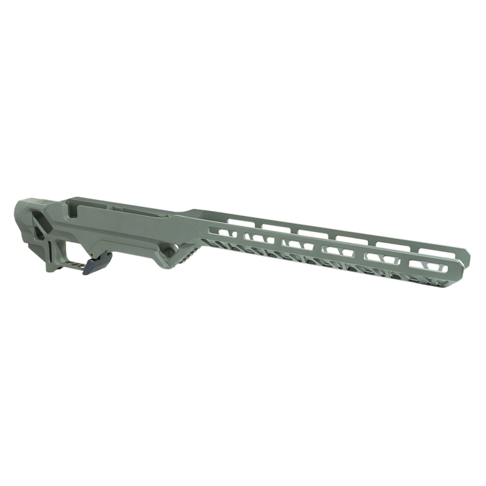 The Timber Creek Enforcer OD Green Rifle Chassis offers a lightweight, skeletonized design, making it an excellent choice for precision shooting enthusiasts. Weighing only 22 ounces, this chassis is engineered for right-handed short action Remington 700 rifles or their clones. Its compatibility with MSR buffer systems ensures a versatile and reliable platform for enhancing your rifle's performance. The OD Green finish not only adds a tactical touch but also provides durability in various conditions.