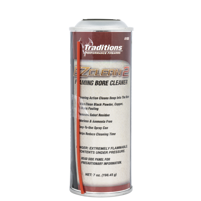 The Traditions EZ Clean 2 Foaming Bore Cleaner is a powerful solution designed to tackle even the toughest black powder, copper, and brass fouling. Its advanced foaming action penetrates deeply, ensuring thorough cleaning of your firearm's bore. The user-friendly spray can allows for precise and controlled application, minimizing waste and maximizing efficiency. This odorless, ammonia-free formula is ideal for those seeking a reliable cleaner that simplifies maintenance. Note that it may affect certain finishes like lacquer, oil, varnish, and shellac. Available in a convenient 7 oz spray can, the EZ Clean 2 is an essential addition to any gun owner's cleaning kit.