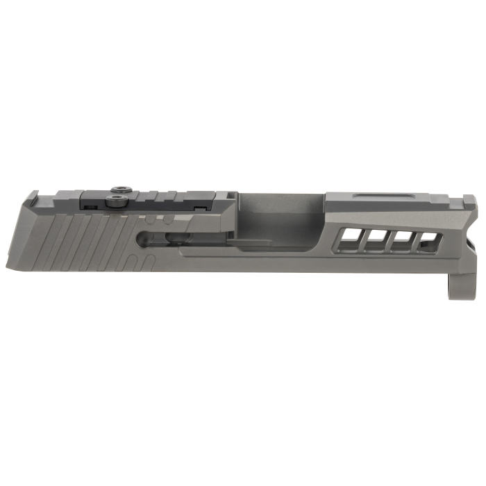 Upgrade your Sig P365 with the True Precision Axiom Slide, crafted from durable 416R stainless steel and finished with a sleek anodized coating. Its innovative lightweight design features sidecut windows and a topmilled pocket, enhancing both style and performance. Experience superior handling with aggressive, scalloped front serrations and angled rear serrations, ensuring a confident grip. Ready for customization, the slide includes an optic cut footprint compatible with Trijicon RMR and Holosun optics, making it a versatile choice for enthusiasts seeking precision and personalization.