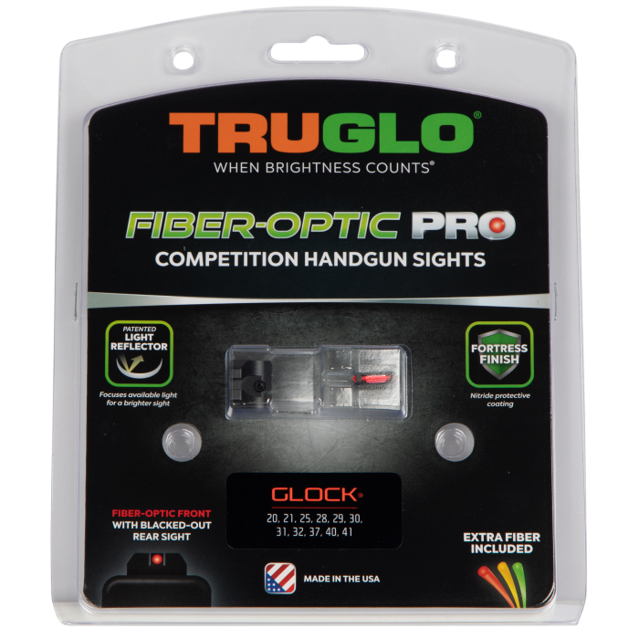 The Truglo Fiber-Optic Pro Sight Set is crafted to enhance your shooting precision with its advanced design. Engineered for use with Glock 21 pistols, this sight set features a vibrant red fiber-optic front sight and a sleek black rear sight. The patented light reflector enhances visibility by channeling available light into the fiber, ensuring a bright glow even in low-light conditions. The front sight is equipped with an ultra-bright fiber optic and serrated edges for quick target acquisition, while the blacked-out serrated rear sight provides contrast to minimize glare. Constructed from durable steel and finished with a black nitride coating, this high-style sight set fits standard holsters and includes spare fiber colors in yellow, ruby red, and green. This sight set is compatible with various Glock models, offering flexibility for different preferences, except for M.O.S. models.