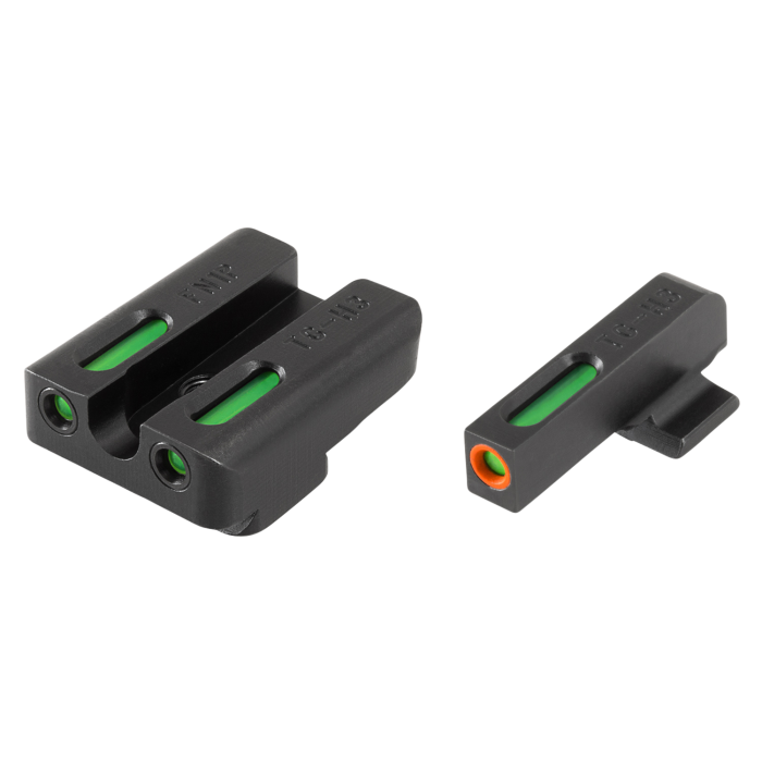 The Truglo TFX Pro Handgun Sights are expertly crafted for precision and durability, specifically designed for FNH FNP-9, FNX-9, and FNS-9 models. These sights offer an advanced combination of tritium and fiber optic technology, ensuring clear visibility in varying light conditions. The front sight features an orange outline for quick target acquisition, while the rear sight presents a distinctive U-notch design for enhanced accuracy. Constructed from CNC machined steel, these sights boast a robust black nitride fortress finish that resists corrosion. The compact, snag-free design allows for a longer sight radius, catering to both tactical and everyday carry needs. With Swiss tritium providing superior brightness, these sights are ready to perform in any situation.