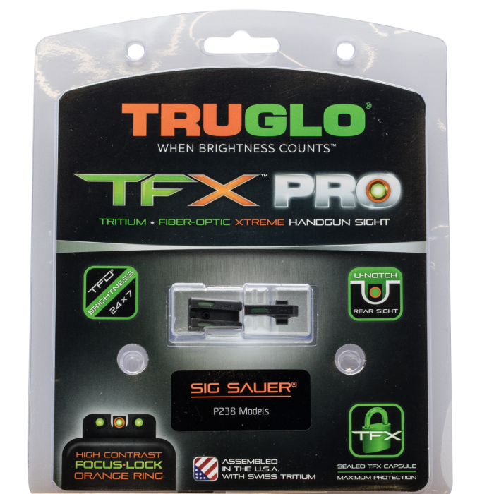 The TruGlo TFX Pro Handgun Sights are expertly crafted for the Sig Sauer P238, offering a perfect blend of precision and durability. These sights feature a unique combination of tritium and fiber optic elements, ensuring visibility in any lighting conditions. The front sight includes an orange outline for quick focus, while both front and rear sights incorporate green tritium for enhanced clarity. Built from CNC-machined steel with a black nitride fortress finish, these sights provide a robust, rust-resistant option for handgun enthusiasts. The compact, snag-free design ensures smooth handling, and the sights are assembled in the USA with high-quality Swiss tritium for maximum brightness and reliability.