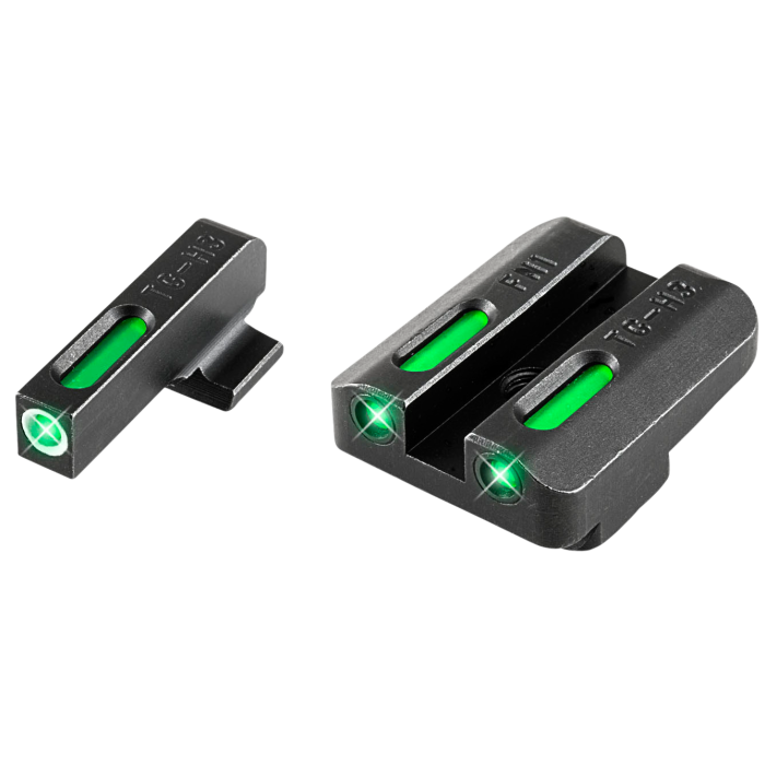 The Truglo TFX Handgun Sight Set is designed specifically for the FNH FNP-9, FNX-9, and FNS-9 models, including compact versions. This sight set offers exceptional visibility in all lighting conditions with its advanced Tritium and Fiber Optic technology. The 3-dot configuration features a distinctive green glow, with the front sight further enhanced by a white outline for quick targeting. Built from CNC-machined steel, these sights are incredibly durable, boasting a black nitride Fortress Finish that resists rust. Encased in a robust, chemical and shock-resistant capsule, the sights ensure longevity and reliability. The compact, snag-free design and longer sight radius contribute to faster and more accurate shooting, while fitting seamlessly into standard holsters. The Swiss tritium component ensures maximum brightness, making this sight set a dependable choice for any handgun enthusiast.