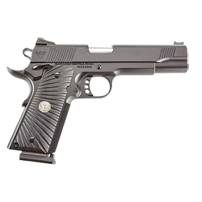 Experience unrivaled performance with the Wilson Combat 1911 CQB in 9mm. This full-size pistol seamlessly blends classic design with modern enhancements, featuring a 5-inch barrel for precise accuracy. Built with a sleek Black Armor-Tuff frame and Black G10 Starburst grips, it ensures a comfortable and firm hold. The serrated slide and fiber optic front sight paired with a Battlesight rear configuration enhance targeting precision. With a 10+1 capacity and ambidextrous grip and thumb safety, this SAO action pistol offers both reliability and safety for discerning shooters.
