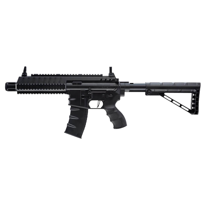 The Umarex Steel Strike Air Gun takes its design cues from a short barreled modern sporting rifle and boasts many of the same features. The Steel Strike uses reliable and easy to find 12 gram CO2 cartridges which are housed in the multi-position stock. Topside are flip up sights and generous sections of accessory rail on the top sides and bottom of the upper. The drop free magazine holds 900 BBs in its main reservoir and features an easy to load staging tube for fast re-loads. Plinking at the range is always a blast but the Steel Strike ratchets the fun up to the top of the scale with its 6 round burst mode.