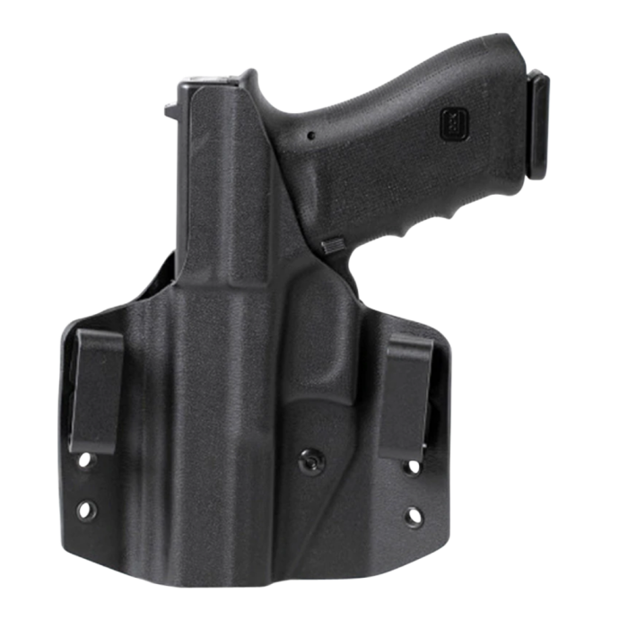 The Uncle Mikes Right Hand Black Boltaron OWB Holster is expertly designed for the Ruger SR, offering a perfect blend of comfort and concealment. Crafted from durable Boltaron material, this holster provides a secure fit while maintaining a sleek appearance. Its concaved contour ensures all-day comfort, and the adjustable dual belt loops allow you to customize the ride height and cant to your preference. Ideal for outside-the-waistband carry, this holster minimizes printing, making it a discreet choice for concealed carry enthusiasts. Whether you're at the range or on the go, trust this holster for reliable performance and comfort.