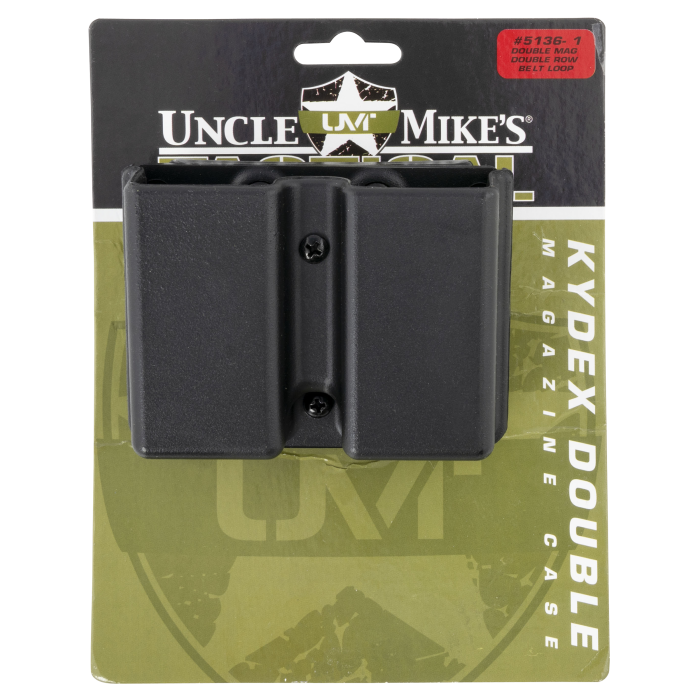 Crafted from durable Kydex, this double mag case by Uncle Mike’s is designed to provide superior protection for your magazines. Featuring an internal tensioning device for added security, it easily fits belts up to 1.75 inches or can be clipped over a waistband for versatile carry. Ideal for 9mm and .40 caliber magazines, its sleek black finish and smooth design deliver a professional, functional look. Reliable, practical, and designed for consistent performance.