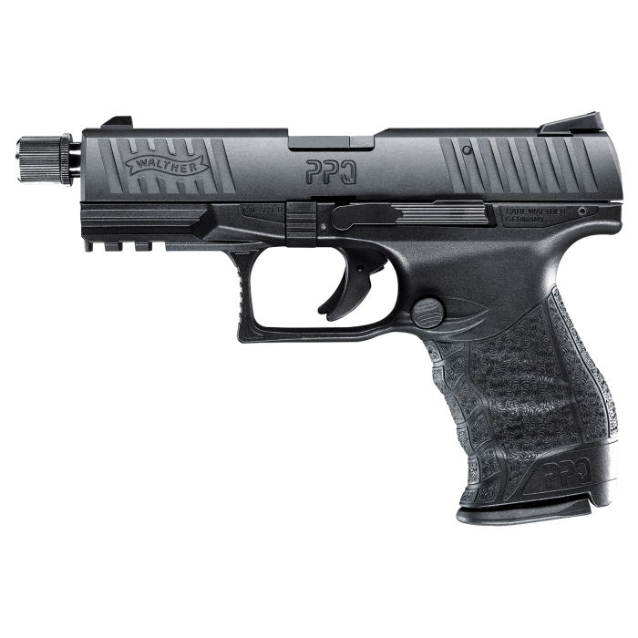 Walther's tactical PPQ M2 SD .22 is the best of both worlds, combining the smooth-shooting, ergonomically-enhanced components of the PPQ with the fun and cost savings of 22 rimfire. This pistol has a polymer frame with an integral Picatinny MIL-STD-1913 rail, a reversible magazine release button, ambidextrous slide stop, and interchangeable backstraps for the perfect fit. It utilizes a quick defense trigger, matte finish Tenifer-coated slide and barrel for corrosion resistance, low profile 3-dot combat sights. It has two drop safeties as well as a firing pin block. The PPQ M2 SD .22 has a 4.6" threaded barrel and is available with a 12+1 capacity.