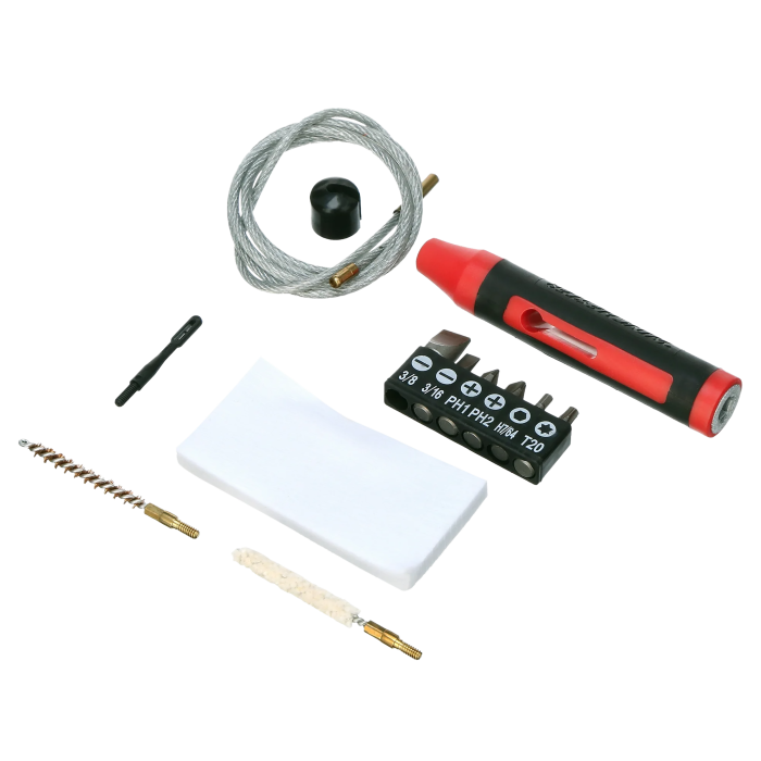 Elevate your firearm maintenance with the Winchester 17 Cal Rifle Cleaning Kit, a comprehensive 12-piece set designed for precision and thoroughness. Housed in a durable red plastic case, this kit features a hybrid multifunction handle, a 33-inch pull rod, and essential cleaning tools like a .17 cal brush and mop. Enhance your cleaning routine with the included slot tip and 25 patches, ensuring your rifle stays in peak condition. The six-piece bit set, featuring Phillips, flathead, star, and hex bits, adds versatility to your toolkit, making it an indispensable choice for any shooting enthusiast.