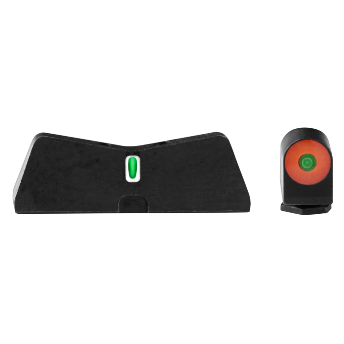 The XS Sights DXT2 Big Dot Night Sight Set is crafted for Glock models 20, 21, 29, 30, 30S, 37, 40, and 41. It is engineered to enhance your everyday carry handgun with its innovative design. Featuring a large, highly visible front sight with a proprietary photoluminescent Glow Dot, it absorbs ambient light to glow brightly in low-light conditions. The orange outline of the front sight ensures optimal visibility during the day, while the green tritium with a white outline at the rear aids in maintaining clarity in various lighting conditions. The shallow V rear sight provides a wide field of view and a low profile, reducing the risk of confusion between front and rear sights during high-pressure situations. Constructed from CNC machined steel, these night sights are robust and reliable, offering a quick and clear sight picture modeled after African big game hunting sights, ensuring that when every second counts, you have the precision you need.